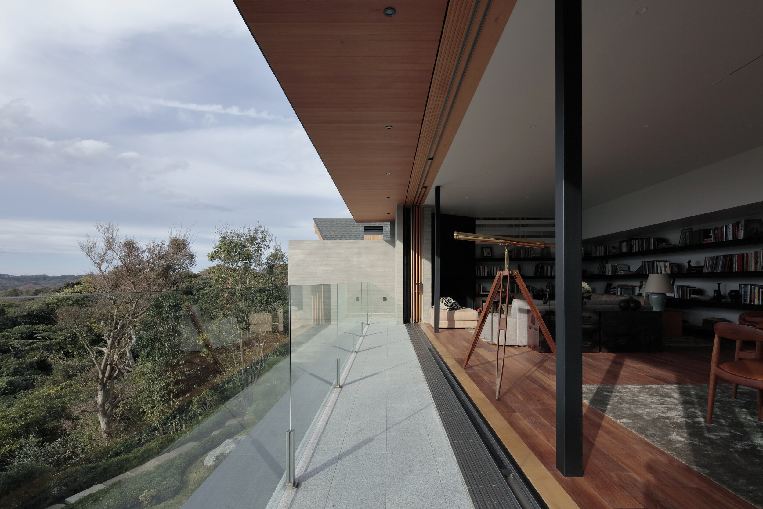 Façade is completely closed design to street side by concrete wall to emphasize privacy, while it is fully opened to the good direction of the landscape as much as possible. The architectural layout and open-close study make it possible to remove disturbing structure from field of view, so that you can focus on the majestic nature and wonderful scenery only.