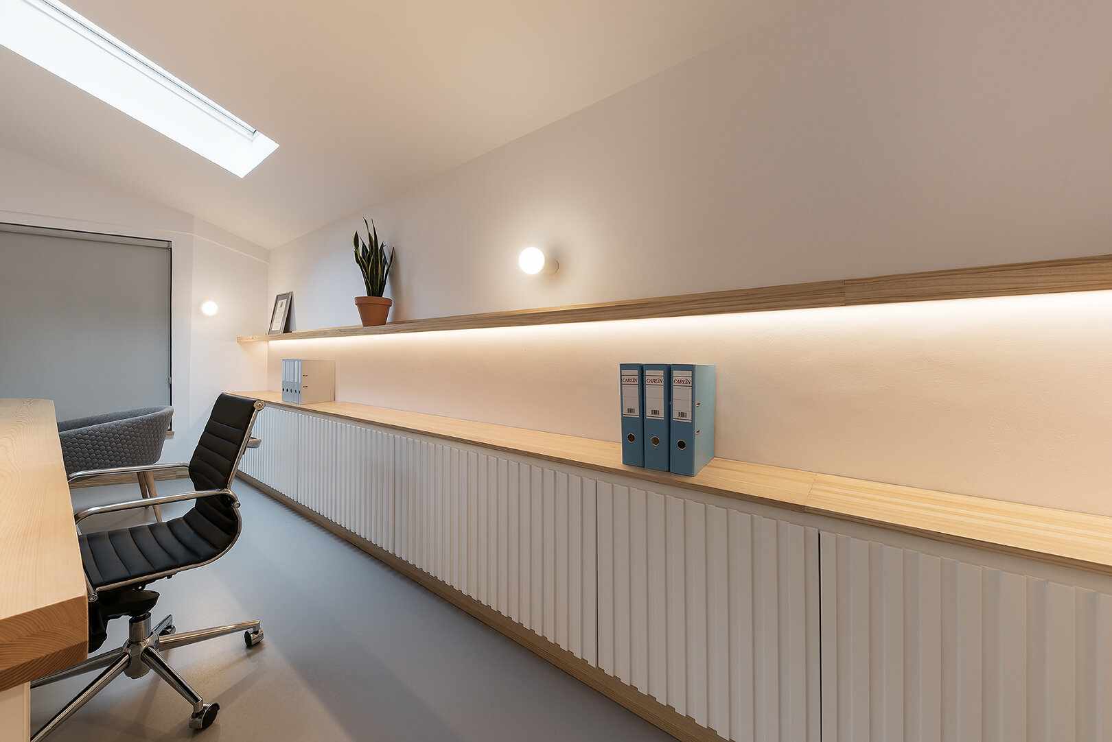 We chose to design a single body that would meet the most important professional needs. In this way, we introduced an element through which the entire project rotated, a large work table. This houses the positions with the computers and, at the same time, in another area of it, the meeting space.